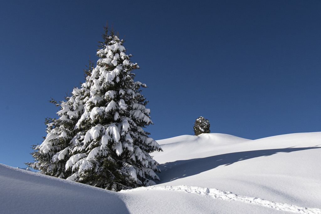 Wir wandern von der Kirche in Bartholomäberg auf 1097 Meter Seehöhe durch eine stille, winterliche Landschaft.